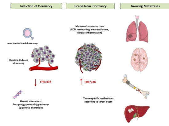 - Sosa, M.S.; Avivar-Valderas, A.; Bragado, P.; Wen, H.-C.; Aguirre-Ghiso, J.A. ERK1/2 and p38α/β Signaling in Tumor Cell Quiescence: Opportunities to Control Dormant Residual Disease. Clin. Cancer Res. 2011, 17, 5850–5857. [Google Scholar] [CrossRef] [PubMed]