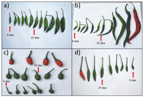 Morphological features of pepper fruit development stages of four Capsicum species. Harvested fruit at different developmental stages from days after pollination of (a) C. baccatum, (b) C. annuum, (c) C. chacoense, and (d) C. eximium. Red arrows indicate small fruit (6-dpa) and middle fruit (25-dpa) stages that were collected for small RNA sequencing.