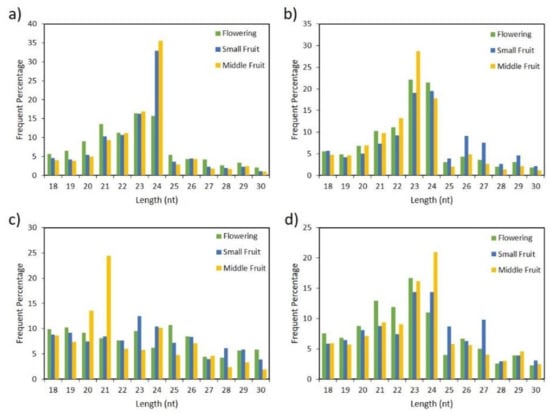 Length distribution of small RNAs in (a) C. baccatum, (b) C. annuum, (c) C. chacoense, and (d) C. eximium at flowering, small, and medium fruit stages.