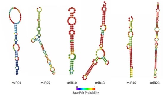 Predicted secondary hairpin structures of six novel miRNAs identified in Capsicum species. Base pair probability is represented by color: red, high-probability, and purple, low-probability.