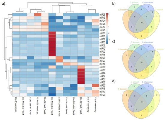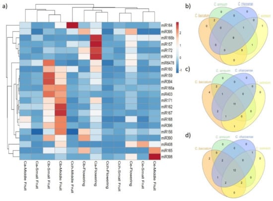 Differential expression analysis of novel miRNAs. (a) Heat map of novel miRNA expression profiles in C. baccatum (Cb), C. annuum (Ca), C. chacoense (Cch), and C. eximium (Ce) at different stages analyzed. The expression levels are represented by the color: red, high-expressed; and blue, low-expressed. Venn diagram analysis of shared novel miRNAs at (b) flowering, (c) small, and (d) medium fruit stages across Capsicum species.