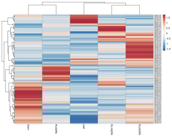 Expression patterns of known and novel miRNA target genes in leaf, stem, and placenta (PL) tissue at 6, 16, and 25 days post-anthesis of C. annuum var CM344. The expression levels are represented by color: red, upregulated; and blue, downregulated.