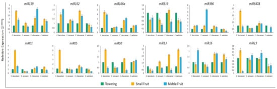 Validation of six known and six novel miRNAs by stem-loop RT-qPCR in Capsicum species at flowering, small fruit, and middle fruit stages. The small nuclear RNA (snRNA) U6 was a housekeeping gene. Data are mean ± SD from three biological replicates.