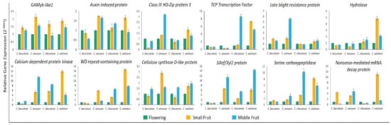 To validate the expression profiles of miRNAs in Capsicum species at flower, small fruit (6-dpa), and middle fruit (25-dpa) stages, we investigated 6 known (miR159, 162, 166a, 319, 396, and 6478) and six novel miRNAs (miR01, 05, 10, 13, 16, and 23) by using stem-loop qRT-PCR based on their sequencing frequencies (Figure 7). In general, expression of most of these miRNAs agreed with sequencing data, with slight variation. The expression profiles of miR162, 166a, 319, 396, 6478, 01, 05, and 16 were consistent with the results from sRNA-sequencing. However, the remaining four miRNAs tested showed inconsistent results between stem-loop qRT-PCR and sRNA sequencing in all or specific Capsicum species. For instance, miR159 showed a discrepancy in C. annuum and C. eximium species, miR10 showed differences in only C. eximium, and miR23 showed a different expression trend in C. annuum. To validate the expression profiles of protein-coding genes targeted by miRNAs, we used qRT-PCR for all Capsicum species at different stages. The expression profiles of auxin-induced protein, class III HD-Zip protein, TCP TF, and serine carboxypeptidase protein, regulated by miR162, 166a, 319, and 016, respectively, showed opposite expression profiles from their target genes, as expected for miRNA targets (Figure 8). As expected, the expression of the remaining predicted targets was not opposite to their miRNA profiles in at least one species, which suggests that the activity of these genes could be determined by translational repression and/or by multiple miRNAs.