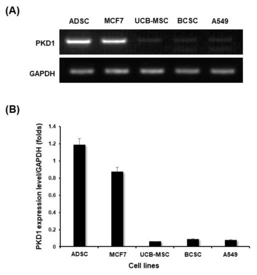 Comparison of PKD expression level according to each cell line. (A) The expression level of the PKD1 gene was confirmed by RT-PCR using mRNA extracted from each cell in the transcript level; (B) Quantitative values of PKD1 expression were normalized by GAPDH.