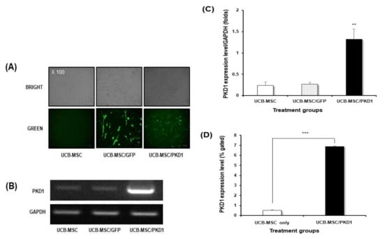 Validation of PKD1 expression in transcript and protein level by PKD1-expressing GFP/lentiviral vector. (A) GFP expression in UCB-MSC transfected with PKD1-expressing vector. PKD1 expression (B) and quantitative data (C) in transcript level of PKD1 expressing UCB-MSC; (D) The expression of PKD1 at the protein level. Data shown represent the mean ± SD (n = 3). ** p < 0.02 or *** p < 0.01 versus UCB-MSC only group.