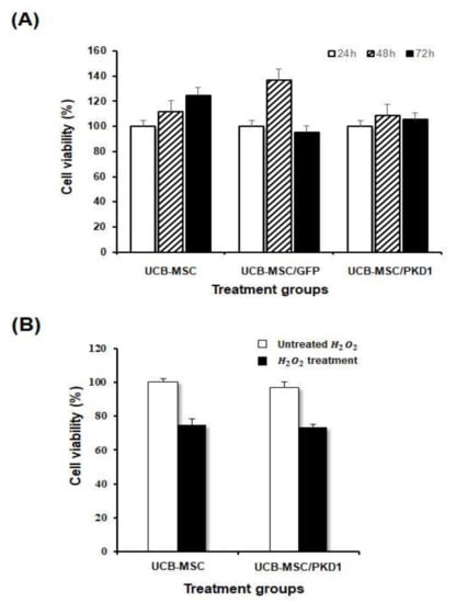 Cells were seeded onto 48-well plates at 2 × 104 cells per well. The PKD1 gene was transfected into UCB-MSC, as described above, according to each condition. After giving a recovery time of 24 h in a 37 °C incubator, cell viability was measured by MTT assay depending on time from 24 to 72 h to confirm cell proliferation [].