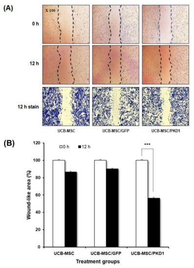 Improved cell migration ability of UCB-MSC by PKD1 expression. (A) To the migration ability of UCB-MSC in the presence of PKD1 expression, the cells were scratched by a 200 uL pipette tip. At 12 h, the cells were stained with crystal violet; (B) Open area was calculated using image J and quantified by percentage values. Data shown represent the mean ± SD (n = 3). *** p < 0.01 for the comparison of 0 h and 12 h in PKD1 expressing UCB-MSC.