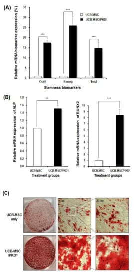 The expression of the increased stemness biomarkers and improved osteogenic differentiation ability of PKD1-expressing UCB-MSC. To evaluate the potential of stem cells by PKD1 transfection, the expression of stemness markers Oct4, Nanog, and Sox2 was detected by RT-PCR, and the differentiation ability of UCB-MSC was examined by alizarine red S staining to confirm the induction level of osteogenic differentiation: (A) The expression level of stemness biomarkers and (B) the expression level of osteogenic differentiation biomarkers induced by PKD1 in UCB-MSC; (C) The degree of the differentiation into osteocyte in PKD1-expressing UCB-MSC via alizarin red S staining. Data shown represent the mean ± SD (n = 3). ** p < 0.02, *** p < 0.01, for UCB-MSC only group versus UCB-MSC/PKD1 group.