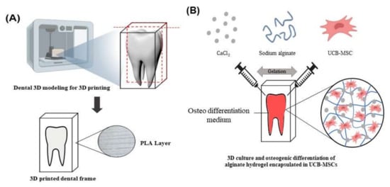 In order to grow UCB-MSC expressing PKD1 to 3D cell culture system in a 3D tooth model, hydrogel was manufactured using alginate, which is a natural polymer material in a teeth template. Sodium alginate and calcium chloride (CaCl2) prepared in a 3 mL syringe were reacted with each other to form a hydrogel via gelation. At this time, to generate hydrogel encapsulated with UCB-MSC/PKD1, stem cells (2 × 104 cells/mL) were suspended in the 2% alginate solution and transferred to a syringe and then were co- mixed with 200 mM CaCl2 solution. The mixture hydrogels were incubated in osteogenic differentiation medium for 12 days. Differentiated cells were identified by Alizarin red S staining and RT-PCR to confirm osteogenic differentiation levels.
