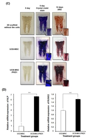 As shown in the result of Figure 6, UCB-MSCs expressing PKD1 in a tooth mimetic 3D model showed significant differentiation ability through alizarin red S stain and osteogenic marker expression in the transcriptome. In addition, when comparing the RNA expression levels of ALP and Runx2 in 2D cell culture and 3D cell culture, it can be seen that the expression of Runx2 is higher than that of ALP in a 2D cell culture (Figure 5B and Figure 6D), and ALP expression was higher in a 3D cell culture system. In the process of osteogenic differentiation of UCB-MSC, Runx2, a major transcription factor related to osteoblast differentiation, is first expressed, undergoes the osteoprogenitor process, and then other enzymes including ALP that promote bone formation are involved [,,]. Therefore, the increased ALP expression level of stem cells cultured in a 3D cell culture environment compared with that of UCB-MSC only means that the differentiation is induced faster when PKD1 is expressed.