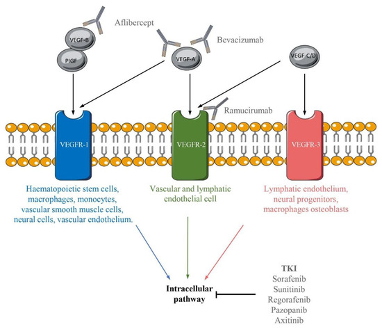 There are many TKI such as Sorafenib, Sunitinib, Regorafenib, Pazopanib, etc., approved for cancer treatment. Others, such as Motesanib (NCT00121628), and Sulfatinib (NCT02549937) are still under investigation. Those antibodies induce an inhibition downstream the ligand/receptor recognition (Figure 1) and have the ability to inhibit the signalization of different receptors. Sorafenib and Sunitinib are the two most described.