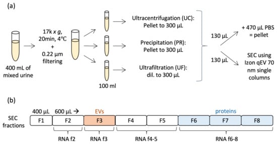 Schematic representation of the study. The protocol was repeated three times. (a) After concentrating and filtering, the mixed urine pool of two donors was divided into three aliquots. Each aliquot was concentrated by ultracentrifugation (UC), precipitation (PR) or ultrafiltration (UF). Half of the concentrated urine was analysed as a “pellet” sample and the other half was further purified with size exclusion chromatography (SEC). (b) During SEC, eight fractions were collected. Small RNA analysis was performed on SEC fractions 2 (“pre EVs”), 3 (“EVs”), combined fractions 4–5 (“middle”) and 6–8 (“non-vesicular proteins”).