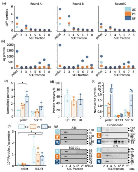 Particle numbers (measured with NTA) and protein quantity within pellets and SEC fractions 2–8 from individual rounds are presented in Figure 2a,b. Particle number peaked within SEC fraction 3, indicating the presence of EVs, and the highest protein quantities were detected in fractions 5–8. Within each replicate, UF resulted in the highest number of vesicles in both the pellet and SEC fraction 3 groups. Since the three replicates were derived from different donors, and thus would contain different quantities of EVs and proteins, the particle number and protein quantity for each replicate was normalised to that of the UC pellet for that replicate, prior to statistical comparison. The normalised mean particle number of the UF pellet was approximately three times that of the UC pellet (p = 0.01) and 1.8 times that of PR pellet, although the latter did not reach statistical significance (p > 0.05) (Figure 2c). The normalised mean particle number of the PR pellet was approximately 1.7 times that of the UC pellet, although this did not reach statistical significance (p > 0.05). After SEC, UF+SEC had the highest normalised particle number (mean 1.55), with PR+SEC and UC+SEC yielding mean normalised particle numbers of 0.80 and 0.65, respectively; however, these differences were not statistically significant. Particle recovery within fraction 3 after SEC (compared with that of the corresponding pellet) was between 46% and 78% for UC, between 35% and 58% for PR, and between 37% and 67% for UF (Figure 2d).