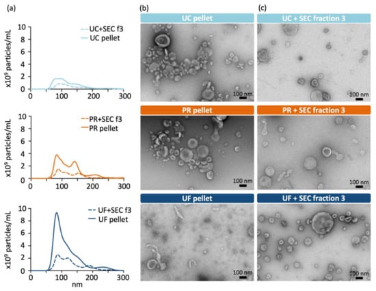 The size distribution of EVs obtained from a single urine pool by the different methods are shown in Figure 3a. Size profiles before and after SEC differed the most in the UF sample, probably due to the removal of (smaller) contaminant particles during the SEC. Similar but smaller shifts in the size profiles were also visible after SEC with UC and PR samples. Transmission electron microscopy (TEM) imaging confirmed that the UF pellet contained large amounts of non-vesicular material, as expected (Figure 3b). UC and PR pellets and all the SEC fraction 3 samples included a heterogeneous population of vesicles, many of which demonstrated a cup-shaped morphology that is expected for EVs in TEM (Figure 3b,c) [,].