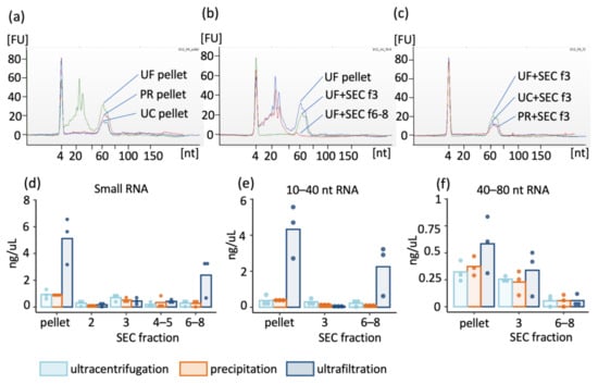 Small RNA profiles of extracellular vesicles (EV) prepared by ultrafiltration (UF), precipitation (PR) and ultracentrifugation (UC) both before and after size-exclusion chromatography (SEC). Representative profiles of samples from individual round of: (a) the pellets before SEC purification, (b) UF profile before SEC, EV containing SEC-fraction 3 and non-vesicular protein fractions 6–8, (c) EV containing SEC fraction 3 from all three methods. RNA concentration from all three rounds showing: (d) Total small RNA concentration in measured fractions, (e) 10–40 nt sized RNA in UF pellets and SEC fractions 3 (EVs) and 6–8 (non-vesicular proteins), (f) 40–80 nt sized RNA in UF pellets and SEC fractions 3 and 6–8. Data are presented as individual values and mean.