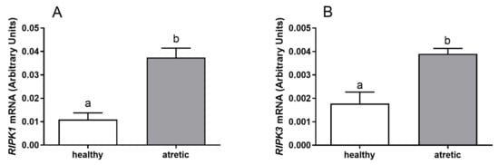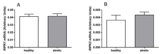mRNA expression levels of (A) RIPK1 and (B) RIPK3 in theca cells of healthy and atretic follicles.