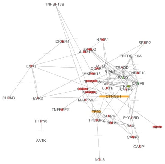 Figure 3 displays the IMEx Network [], where the connections are not tissue specific. However, Figure 3 also shows the basal expression values of chosen genes in the ovary, mapped to the node size. As shown in Figure 3, RIPK1 was expressed while RIPK3 expression was very low (small node size). Note that RIPK1 together with FADD, TRADD, CASP8 and TNFRSF1A are expressed in apoptosis and they all occur in Figure 3. Thus, apoptosis may take place in the ovary. The complex: MLKL, RIPK3 and RIPK1 is characteristic of necroptosis. The direct connections between RIPK3 and MLKL and between RIPK1 and RIPK3 shown in the graph were derived from the IMEx database in which curated interactions (not tissue specific) are stored. The color of the nodes was mapped to the node degree (number of edges) (here green represents a high degree; yellow represents a medium degree; and red represents a low degree). Table A2 and Table A3 in the Appendix A show genes with the highest degree and betweenness centrality (the number of times a node acts as a bridge along the shortest path between two other nodes).