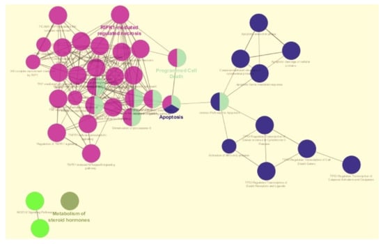 The action relationships (expression, inhibition and activation) between the nodes were determined by CluePedia []. A file representing interactions between nodes was extracted from the STRING database [] (on 17 February 2020) available in CluePedia []. Next, to assess functional annotation of the hub genes, ClueGO + CluePedia [] were applied and biological pathways of the hubs in Figure 4 represent one or more functions (for example, the Apoptosis hub represents three functions). The pathways illustrated in Figure 4 which are associated with apoptosis and programmed cell death are studied in more detail using nested networks and CluePedia networks (see Section 5). The pathways are connected with the following settings in CluePedia []: assigned kappa score 0.5; corrected p-value < 0.05; number of genes per term equal to 3; percentage for the queried terms equals to 4; the Bonferroni setting was used with the p-value correction; and lastly two-sided (enrichment/depletion) tests based on hypergeometric distribution for terms and groups was selected. These settings were used also while retrieving functional annotations for the reduced list of genes. However, in the case of using the reduced list of genes, the Reactome Pathways database [] was first used to create the functional terms.