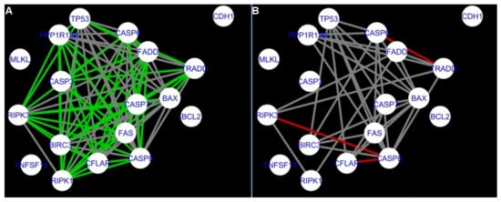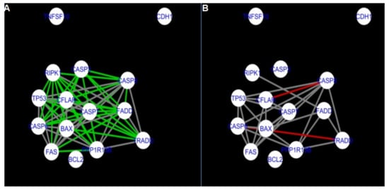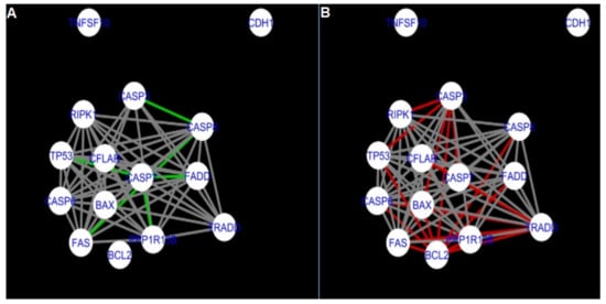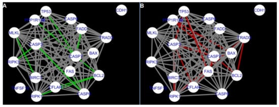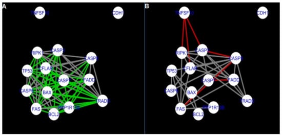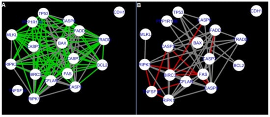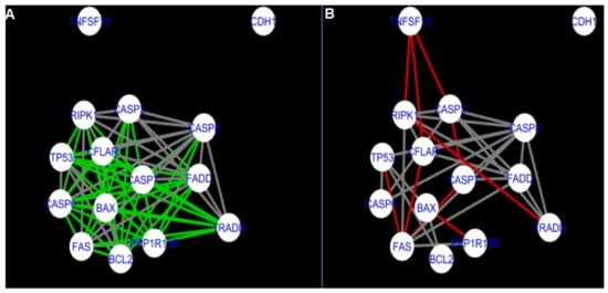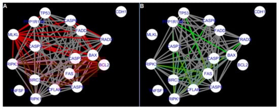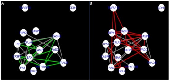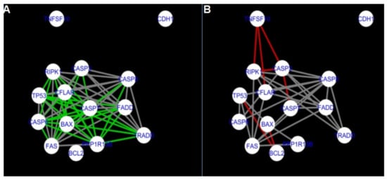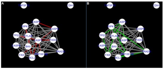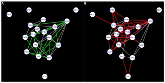 Apoptosis: Network created using String-action and in CluePedia for group A1. (A) shows the network built for granulosa cells of newly selected follicle (edges shown in green are characteristic for this network). (B) shows the network created based on the String-action interactions (edges marked in red are found only in the String-action network). Edges marked in grey occur in both networks.