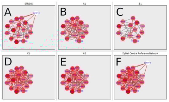 The PPI network (protein–protein interaction) was created based on human protein interactions (the gene names and uniprot symbols used are shown in Appendix A Table A1). Functions played by proteins are closely conserved among species [] and interactions recorded in humans are likely to occur similarly in bovines.
