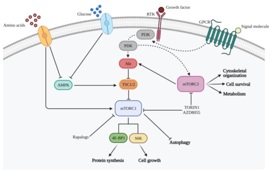 Representative image of the main signaling pathways that regulate mTOR. mTORC1 is able to capture and transduce signals from different stimuli, such as the presence of growth factors, amino acids, and glucose through the mechanisms indicated. Once activated, mTORC1 promotes cell growth and proliferation, inducing various anabolic processes, including protein synthesis, and inhibiting catabolic processes, such as autophagy. mTORC2, on the other hand, performs an important regulatory function of the cytoskeleton, cell survival, and metabolism and phosphorylates the Akt kinase, determining its activation. This image was created with BioRender software.
