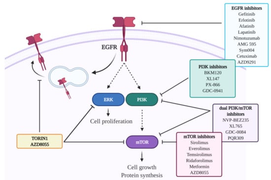 EGFR/PI3K/mTOR signaling pathway and inhibitory molecules used in preclinical and clinical studies for glioma therapy. Upon binding to its ligand or genetic alterations, EGFR is activated and triggers a series of cascade reactions. Among these reactions, the phosphorylation and the consequent activation of the ERK pathway and the PI3K/mTOR axis regulate cell growth, proliferation, motility, survival, transcription, and protein synthesis. Many molecules have been developed and employed targeting EGFR, PI3K, and mTOR proteins. Recently, mTOR inhibition by Torin1 and AZD8055 has been shown to mediate EGFR internalization and its delivery to lysosomes in GBM cells [54]. This image was created with BioRender software.