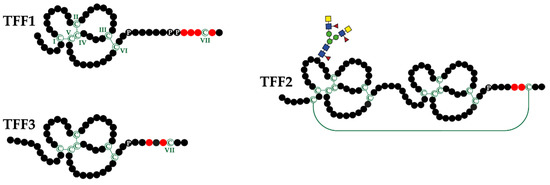In humans, secretory trefoil factor family (TFF) peptides comprise TFF1, TFF2, and TFF3 (reviews: [1,2,3,4]). They share characteristic cysteine-rich modules (TFF domains [5]; formerly trefoil domains [6], P-domains [7]), where six cysteine residues form three intramolecular disulfide bridges in the order CysI-V, CysII-IV, and CysIII-VI (Figure 1). Both TFF1 and TFF3 contain a single TFF domain and a 7th cysteine residue at their C-terminal outside the TFF domain (CysVII). In contrast, TFF2 contains two TFF domains and two additional cysteine residues, the latter connecting the C- and N-terminal via a disulfide bridge (Figure 1). There are indications that the resulting circular structure occurs in different forms (maybe supercoils) [8,9]. In spite of their overall similarity, there is probably a major structural difference between TFF1 and TFF3 concerning the nucleophilicity of CysVII, which is enhanced in TFF1 by steric exposure (neighboring proline residues, Figure 1). Remarkably, human TFF2 is N-glycosylated (gastric TFF2 bears an unusual fucosylated LacdiNAc oligosaccharide [10]); whereas murine and porcine TFF2 lack N-glycosylation sites. Generally, TFF peptides have been characterized from frogs to humans thus far [11].