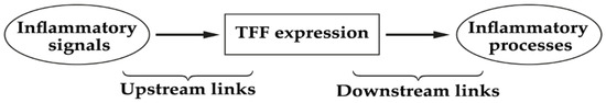 Numerous studies addressed the following question: which signals trigger the expression of TFF peptides during inflammation, and are there differences between the three TFF genes? Further questions asked were as follows: (i) is a loss of TFF peptides linked to inflammation, and (ii) is the expression of cytokines regulated by TFF peptides? The data concerning the multiple links of TFF peptides and inflammation are rather complex, partly seemingly controversial and often based upon single observations in a variety of very specialized systems. In order to get a glimpse on this complex interplay, the topic is discussed on two different levels (Figure 2): (i) complex regulation of TFF expression by inflammatory mediators (upstream links; Section 2); and (ii) role of TFF peptides in inflammatory processes (downstream links; Section 3). This scheme does not exclude possible feedback loops, e.g., those between inflammatory processes and the regulation of TFF expression (see Section 4.1).