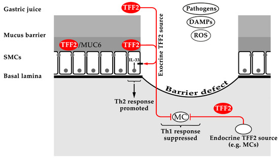 Schematic representation of the putative functions of TFF2 in the normal gastric mucosa as well as after injury/infection. The TFF2/MUC6 complex probably stabilizes the inner gastric mucus barrier layer at the apical side of surface mucous cells (SMCs); the mucus as well as the luminal content of the stomach are separated by tight junctions from the basolateral side of SMCs. After a barrier defect, exocrine TFF2 might stimulate a putative TFF2 receptor (such as CXCR4) at the basolateral surface, leading to an increased synthesis of the nuclear alarmin IL-33 and promotion of a Th2 response (after IL-33 release probably by a non-classical secretory mechanism via exosomes [161]). Furthermore, exocrine TFF2 as well as TFF2 from endocrine sources probably have an inhibitory effect on myeloid cells (MC; see also Section 4.1), repressing a Th1 response.