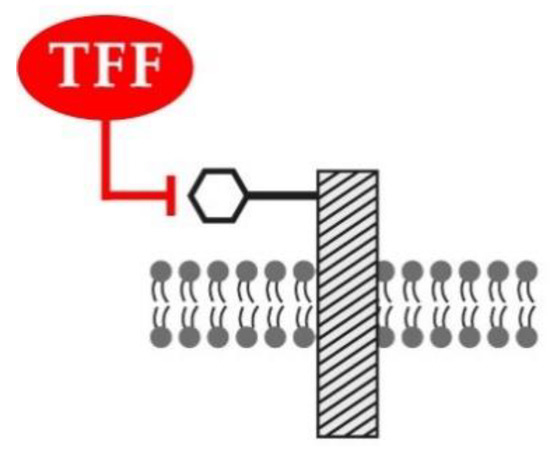 In contrast to a proposed lectin-triggered activation of receptors [23], TFF peptides can, in particular, block the ligation of natural ligands and their cognate membrane receptors. This has been demonstrated for TFF1, which blocks the interaction of IL6Rα-gp80 (IL-6 binding chain) and gp130 (signal-transducing chain) in vitro by interaction with IL6Rα-gp80 [147]. As a consequence, several STAT3 target genes are overexpressed in Tff1KO mice [147]. The precise nature of TFF1 binding to IL6Rα-gp80 has not been elucidated thus far, but it is tempting to speculate that TFF1 acts as a lectin binding to the carbohydrate moiety of IL6Rα-gp80, which blocks receptor activation (lectin-triggered receptor blocking hypothesis; Figure 4).