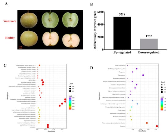 Watercore symptoms, number of DEGs, GO classification and KEGG enrichment of DEGs. (A)“Akibae” watercore symptoms; (B); Number of DEGs; (C) GO classification; (D) KEGG enrichment of DEGs.