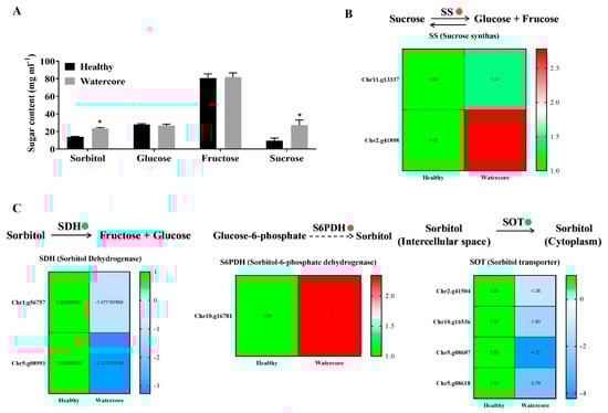 Changes of sugar components’ contents and their metabolism-related gene expression in watercore fruit. (A) Changes of sugar components’ contents; (B) Changes of sucrose synthas genes expression; (C) Changes of sorbitol degradation, synthesis and transport genes expression. The red and green circles refer to up- and down-regulation of gene expression, respectively. * The asterisk on the bars indicates significant differences between the watercore and healthy fruit at p < 0.05.