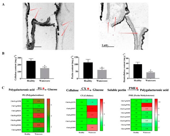 Transmission electron microscopy (A), cell wall components (B) analysis and their metabolism-related gene expression (C) in watercore fruit. Red 1–3 refer to cell wall, residual cytoplasm and cell wall cellulose, respectively. The red circle refers to up-regulation of gene expression. * The asterisk on the bars indicates significant differences between the watercore and healthy fruit at p < 0.05.