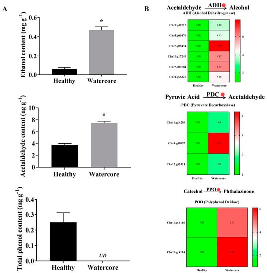 Analysis of ethanol, acetaldehyde and total phenols content (A) and their metabolism-related gene expressions (B) in watercore fruit. The red circle refers to the up-regulation of gene expression. The asterisk on the bars indicates significant differences between the watercore and healthy fruit at p < 0.05. UD: Not detected.