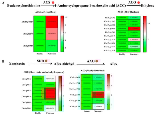 Analysis of ethylene (A) and abscisic acid (B) metabolism-related gene expression in watercore.