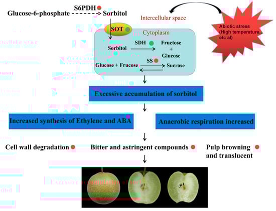 Above all, we speculated a model in which watercore negatively influences pear fruit quality (Figure 6). The changes in the external environment, such as high temperature, lead to increases in sorbitol and sucrose synthesis gene expression or decreases in the gene expression of sorbitol transport and degradation in pulp cells, resulting in the accumulation of sorbitol and sucrose in the pulp. The excessive levels of sugars in cells and intercellular spaces can increase the synthesis of ABA and ethylene, and accelerate the degradation of the cell wall and the softening of the fruit. In addition, excessive sugars can also lead to an increase in anaerobic respiration, which makes polyphenols oxidized and leads to the browning of pulp. The anaerobic respiration of pulp will also accumulate too many bitter substances, resulting in a poor taste. Hence, this study provided further information for understanding the molecular mechanisms of the different reactions of pear pulp to watercore stress.