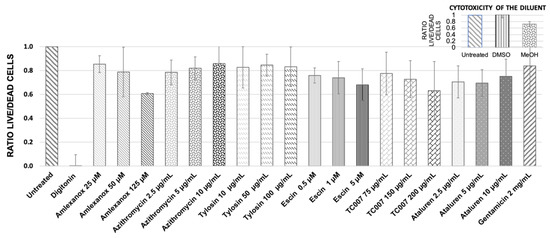 A Promega Multitox-Fluor cytotoxicity assay was used to simultaneously measure cell viability and death in primary nasal epithelial cells (PNECS) from n = 4 healthy donors treated with the following NAGs: amlexanox (125 µM, 50 µM, 25 µM), azithromycin (10 µg/mL, 5 µg/mL, 2.5 µg/mL), escin (5 µM, 2.5 µM, 1.25 µM), tylosin (100 µg/mL, 50 µg/mL, 10 µg/mL), ataluren (10 µg/mL, 5 µg/mL, 2.5 µg/mL), and TC007 (200 µg/mL, 100 µg/mL, 75 µg/mL). Untreated control cells were used as a 100% live reference (with a live/dead cell ratio = 1.0), and cells treated with digitonin 50 µg/mL caused 100% cytotoxicity (live/dead ratio = 0.0). Cells treated with the highest “carrier only” concentration of DMSO (1:280), the diluent for amlexanox, azithromycin, and ataluren, did not exert any cytotoxic effect, as evidenced by a live/dead ratio of 1.0 (Figure 1, inset). The PNECs were, however, susceptible to MeOH (the diluent for escin), which at the highest carrier-only concentration of 1:2000 gave a live/dead ratio of 0.75 (Figure 1, inset). The PNECs were also treated with previously optimized AG (2 mg/mL gentamicin [22]), and the live/dead ratio was 0.86 (Figure 1).