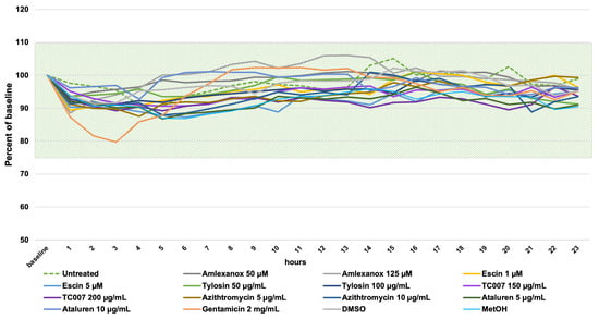 Time-lapse high-speed video microscopy (HSVM) at 37 °C was used to observe and measure the effect of NAGs on the ciliary beat frequency (CBF) as a surrogate for cilia health (with an in-house normal range of 11–20 Hz [36,37]). PNECs were seeded into 24-well culture plates, and using a motorized stage driven with time-lapse software, repeated hourly cilia measurements (at three x, y, z points corresponding to ciliated clusters of PNECs) were recorded for 24 h. Baseline CBFs were recorded prior to PNEC treatment with NAGs or controls. During the observation period, the CBF of cells treated with all amlexanox and gentamicin concentrations did not show significant changes (p > 0.05). For all other tested compounds, we observed a slight drop in the CBF from 14.2 Hz ± 0.61 at the baseline to 13.78 ± 0.19 Hz (p < 0.001), but this remained within the expected normal CBF range. Variability was observed in the untreated cells (Figure 2, green dotted line); we concluded that the small CBF fluctuations observed after NAG administration were a result of the natural CBF variability. PNECs treated with 2 mg/mL of gentamicin demonstrated a 20% reduction in CBF (13.81 Hz ± 0.85 to 11.04 Hz ± 1.26), which sustained during the first 4 h after compound administration before returning to the baseline CBF (Figure 2, orange line).