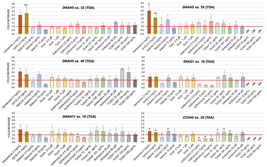 To estimate the efficiency of PTC-readthrough stimulation, the ratio of fluc activity to rluc activity in the lysates of NAG-treated cells transfected with a PTC-containing construct was calculated. Then, the values were normalized to the fluc/rluc ratios obtained from the cells transfected with the corresponding wild-type construct (not treated or treated with NAG). The PTC-readthrough efficiency was shown as a fold-increase over untreated cells. All reported values were the average of at least three experiments. TC007 was tested only for three PTCs (DNAH5 ex. 32 and 49 and DNAH11 ex. 70) because of the limited stock of this experimental compound.