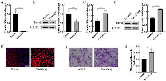 To confirm the expression of Tnmd in tendon tissue and cells, the mRNA and protein analysis of Tnmd confirmed that Tnmd was markedly reduced in cultured tenocytes compared with tendon tissue (Figure 1A,B). Next, the gene and protein expression of Tnmd was analyzed in loaded tenocytes. The results showed that tenocytes exposed to stretching of 10% strain, 0.5 Hz, for 1 h had a higher expression of Tnmd at the mRNA (Figure 1C) and protein (Figure 1D,E) levels compared to the unstretched tenocytes. Moreover, the transwell assay was utilized to detect the migration behavior of mechanically loaded tenocytes. Data revealed a significant increase in tenocyte migration in loaded tenocytes (Figure 1F,G). These results infer a possible association between mechano-induced Tnmd expression and tenocyte migration.