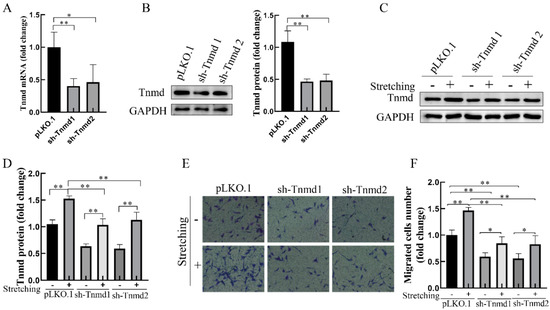 To further investigate whether Tnmd could directly regulate the tenocyte migration, the migration ability of tenocytes was assayed after Tnmd knockdown with lentiviral short hairpin RNA (sh-RNA). Compared with the control silencing group (pLKO.1), the mRNA and protein of Tnmd in Tnmd-knockdown groups (sh-Tnmd1 and sh-Tnmd2) decreased significantly (Figure 2A,B). Moreover, stretch-stimulated tenocytes showed a higher Tnmd expression than Tnmd knockdown tenocytes stimulated with mechanical stretching (Figure 2C,D). As expected, the migration of tenocytes was also significantly reduced in Tnmd knockdown cells exposed to mechanical stretching (Figure 2E,F). These findings suggest that tenocytes translated force into Tnmd signals that promote the migration of tenocytes.