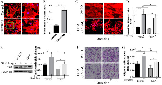 The actin cytoskeleton is essential for rapid mechanical signals transmission within the cells. To explore the possible role of actin cytoskeleton in the stretch-induced Tnmd and tenocyte migration, we evaluated F-actin cytoskeleton organization in response to mechanical stretching. Compared with the unstretched group, stretched-tenocytes exhibited thickening actin stress fibers (Figure 3A,B). To further investigate the effect of actin stress fibers on stretch-induced Tnmd expression and tenocyte migration, the expression of Tnmd and tenocyte migration was detected after pre-incubation with actin-depolymerizing drug Lat A (0.5 μM), which effectively disrupts the formation of actin stress fibers (Figure 3C,D). We found that the tenocytes exposed to stretching in the presence of Lat A displayed decreased Tnmd expression compared to the stretched tenocytes without Lat A. The transwell assay showed that tenocyte migration was increased in cells subjected to stretching, whereas cells stretched in the presence of Lat A displayed a significant decrease in the tenocyte migration (Figure 3F,G). Moreover, considering that the Rho-associated coiled–coil kinase (ROCK) is a specific factor of actin stress fibers, we evaluated the effect of ROCK inhibitor Y27632 on stretching-increased Tnmd expression and tenocyte migration. The results showed that inhibition of actin stress fibers using Y27632 abrogates stretching-induced Tnmd expression and tenocyte migration (Supplementary Figure S1). These results suggest that actin stress fibers are important for induction of Tnmd and tenocyte migration in stretched cells.