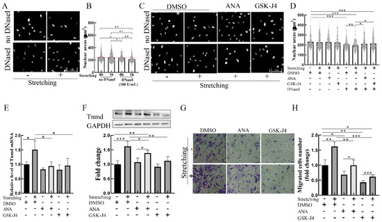 We next determined whether chromatin decondensation is responsible for stretch-induced Tnmd expression and migration. Two specific agents—histone acetyltransferases inhibitor (ANA) and demethylases inhibitor GSK-J4—were used to inhibit chromatin decondensation. The results showed that treatment of tenocytes with ANA or GSK-J4 resulted in increased chromatin condensation in loaded cells compared to the loaded cells in the absence of an inhibitor (Figure 4C,D). To determine the effect of condensed chromatin on stretch-induced Tnmd expression and tenocyte migration, tenocytes were preincubated with ANA or GSK-J4 for 1 h and then stimulated with stretching. The results showed that tenocytes exposed to stretching in the presence of chromatin decondensation inhibitor ANA and GSK-J4 had a lower expression of Tnmd at the mRNA level (Figure 4E). Moreover, we found that, compared with stretched tenocytes, Tnmd protein expression and tenocyte migration were abrogated in ANA-treated loaded cells or GSK-J4-treated loaded cells (Figure 4F–H, respectively). These results suggest that chromatin condensation resulting from histone acetylation and methylation might contribute to stretched-induced Tnmd expression and tenocyte migration.