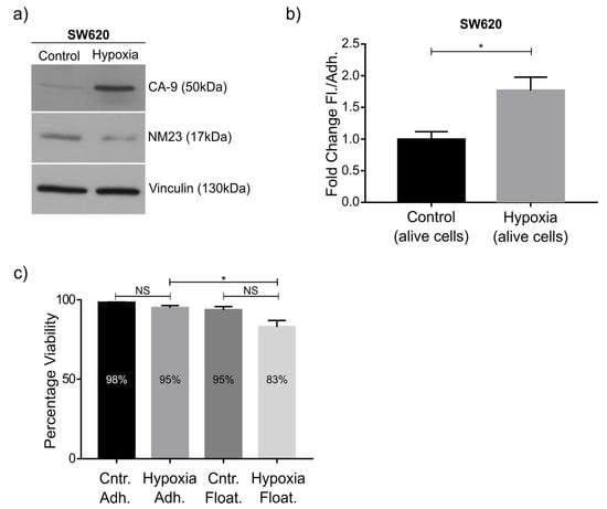 Treatment of SW620 cells to hypoxia. (a) Western blot showing upregulation of the hypoxia marker carbonic anhydrase 9 (CA-9) after growing SW620 cells for 48 h under hypoxic conditions (0.5% oxygen). Downregulation of NM23-H1 was observed (calculated as 2.1-fold). (b) Quantification of fold changes in the number of floating cells compared to adherent SW620 cells, showing a significant increase in the ratio of floating cells upon hypoxia. (c) No statistically significant change in the number of dead cells was observed for either adherent or floating cell populations under hypoxic conditions. Graphs indicate standard error of the mean (SEM). * indicates statistical significance with a p-value below 0.05 based on an unpaired two-sided Student’s t-test (b) and one-way ANOVA with Tukey’s multiple comparisons test (c) of n = 3 independent experiments.