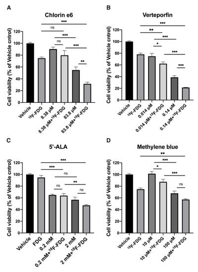 In vitro effect of CR-PDT with 18F-FDG. Cell viability assay comparing (A) Chlorin e6, (B) Verteporfin, (C) 5′-ALA and (D) methylene blue with and without treatment with 18F-FDG on ES2-luc cells. In each group, 3.7 MBq of 18F-FDG was used. Values are means ± SD (Each experiment was performed in triplicates and replicated 3X). * p < 0.05, ** p < 0.01, *** p < 0.001 and n.s., nonsignificant by Student’s t-test.