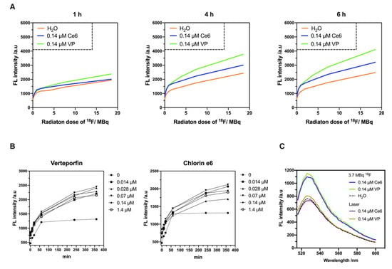 Among all ROS generated by the photoexcitation of PSs, singlet oxygen (1O2) is regarded as a highly effective killer of tumor cells. The lifetime of 1O2 is less than 0.04 μs and the radius of action is only approximately 0.02 μm in cells, thus contributing to the destruction of local tumors while reducing the risk of damage to surrounding normal tissue [19]. Herein, the efficiency of the PSs that applied in CR-PDT was evaluated by measuring the 1O2 production. The fluorescence (FL) intensity at 530 nm after exposure to an increasing dose of 18F was recorded, showing that the FL intensity was increased with increasing radiation doses and exposure time (Figure 2A). A comparison of the FL intensity between Ce6 and VP at the same concentration (0.14 μM) indicated that VP was more efficient in the generation of 1O2 and maintained for a long time. Despite some increase of FL intensity being observed in the mixture of fluoro-18 (18F) and the SOSG solution, which is the fluorescent probe for 1O2, both trend and intensity were much smaller than the fluorescent signal from the PS-containing solution (Figure S3). The 18F excited at 504 nm did not induce fluorescence emission as a check. Furthermore, the effects of the Ce6 and VP concentrations on the fluorescence performance were examined after exposure to a fixed radiation dose (3.7 MBq, as used in in cell viability tests). As shown in Figure 2B, the FL intensity increased with the exposure time and exhibited an upward trend in the presence of various concentrations of VP as well as Ce6 (ranging from 0.014 to 1.4 μM). However, there were no obvious trends of the FL intensity along with increasing concentration, and the FL signals actually declined at higher concentrations of Ce6 or VP, implying the self-quenching of the PSs occurred to limit 1O2 production (Figure S4). Despite this, the efficiency of VP was slightly higher than Ce6 under the CR derived from 18F.