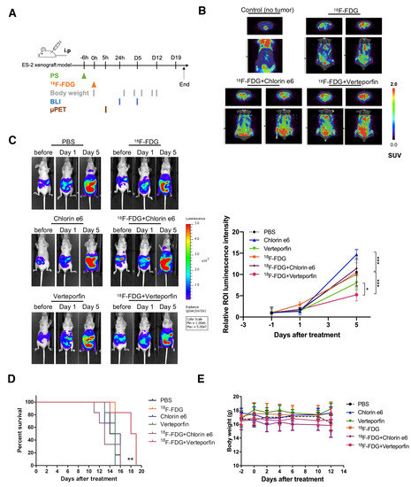 Six-week-old female Balb/cAnNCrj-nu/nu mice (body weight, 16.9 ± 1.0 gm) were purchased from National Laboratory Animal Center (NLAC), NARLabs, Taiwan. Mice were group-housed (three to five animals per cage) in individually ventilated cages (IVC) systems. All animal procedures were carried out in strict accordance with the recommendations in the Guide for Care and Use of Laboratory Animals. The protocol was approved by the Committee on the Ethics of Animal Experiments of the National Yang Ming Chiao Tung University (IACUC number: 1081007r, permission date: 18 October 2019). To establish the xenografts, 2 × 106 ES2-luc cells in 150 μL phosphate-buffered saline (PBS, Sigma-Aldrich, St. Louis, MO, USA) were injected intraperitoneally into the animal’s right lower abdominal quadrant. A therapeutic efficacy study was conducted at 6 d after cell injection. Tumor-bearing mice were randomized into six groups of six animals per group for the following treatments: (1) PBS (control), (2) 37 MBq of 18F-FDG injection only (18F-FDG), (3) Ce6 (40 mg/kg body weight), (4) VP (45 mg/kg body weight), (5) Ce6 followed by 37 MBq of 18F-FDG and (6) VP followed by 37 MBq of 18F-FDG. For intraperitoneal injection of PS, VP and Ce6 stock solutions were diluted with Tween 80 (Sigma-Aldrich, St. Louis, MO, USA) and PBS (ratio = 20:10:70) to achieve a final concentration of 10 mg/mL. All mice were kept fasting overnight and injected 18F-FDG intraperitoneally at 6 h after administration of PS and weighed to evaluate the systemic toxicity every two days.