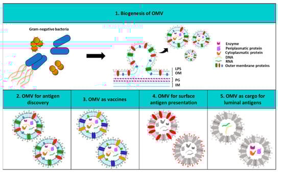 Outer membrane vesicles (OMV) biogenesis and biomedical applications. (1) The upper panel shows the structure of the OMV originating from the outer membrane of Gram-negative bacteria. In the other panels the wide range of OMV applications is depicted. In particular, (2) OMV can be used as an antigen discovery tool; (3) bacterial OMV are excellent vaccines since they trigger both humoral and cellular immune responses following the immunization; (4) OMV can be decorated on their surface with desired heterologous and homologous protein or saccharide antigens; (5) OMV can also function as cargo delivery of specific luminal recombinant antigens. LPS: lipopolysaccharide; OM: outer membrane; PG: peptidoglycan; IM: inner membrane.