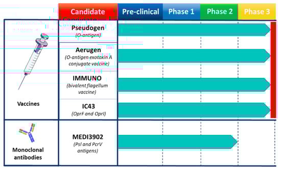 Human vaccines and monoclonal antibodies (mAbs) used to tackle P. aeruginosa infections. In the candidate sections are reported the trademarks and the specific targeted antigens. Pre-clinical and each clinical phase are represented. Red line indicates the phase at which studies were interrupted.